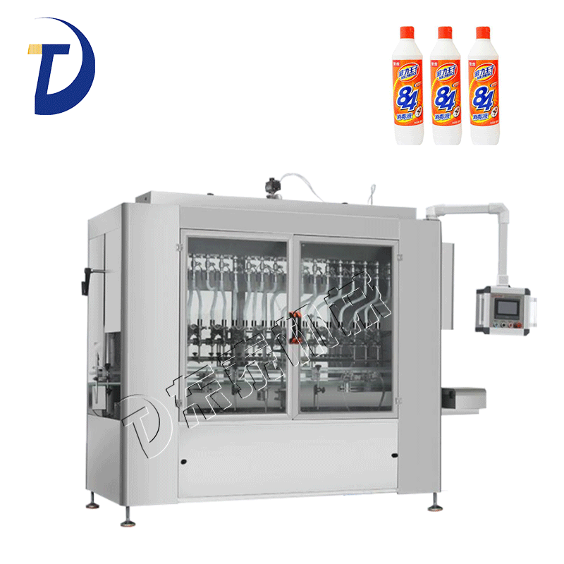 說明:該84消毒液灌裝機設(shè)備,根據(jù)客戶物料,可定制為防腐,防爆機型。與自動理瓶機、自動旋蓋機、標簽貼標或套標機、裝箱打包機組成灌裝流水線。