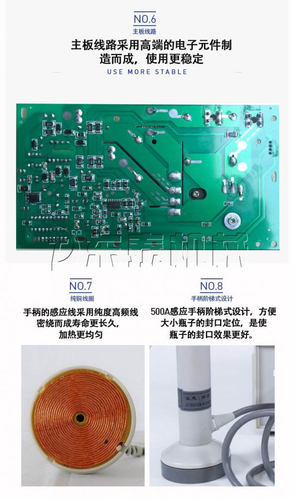 小型半自動(dòng)鋁箔封口機(jī)采用國外先進(jìn)線路,選用日本最新模塊化功率器件,較于一般電子感應(yīng)加熱器更省電,熱效率達(dá)到90%以上,瞬時(shí)加熱速度為后者的20-30倍,因此不僅適用于熱封性能較好的聚乙烯、聚丙烯材質(zhì)的瓶體,而且對(duì)熱封性能較差的聚酯瓶、玻璃瓶也有極好的封口效果。